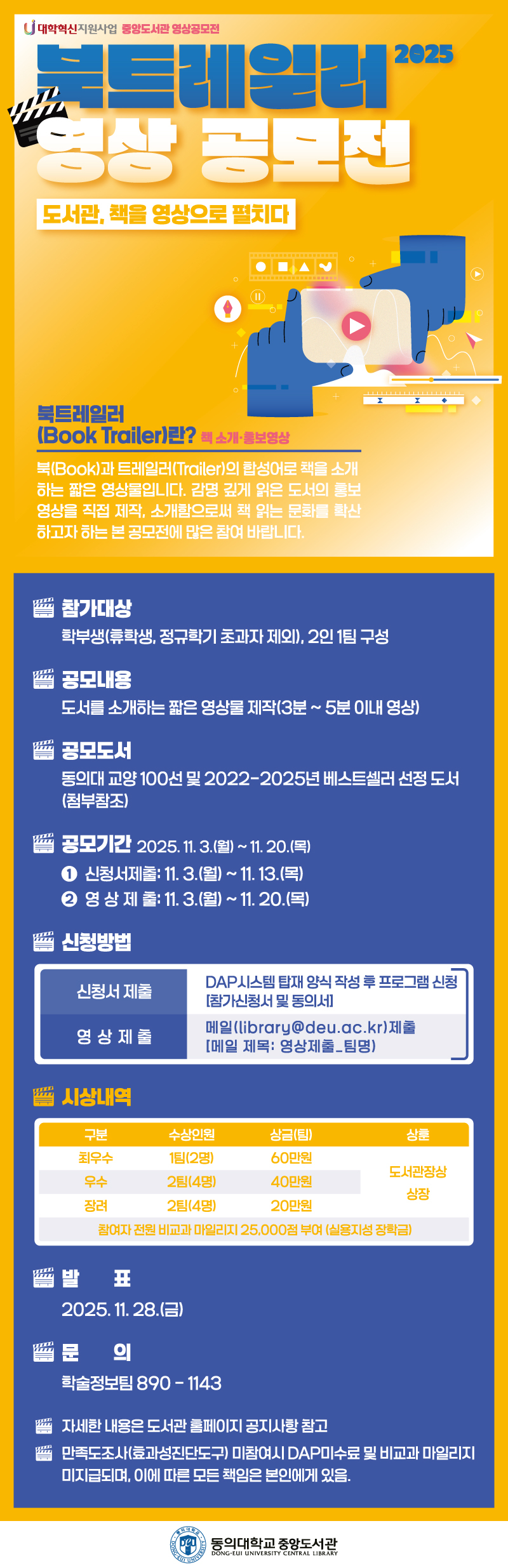 영상 제출 - 메일(library@deu.ac.kr) 제출, 파일명은 영상제출_팀명