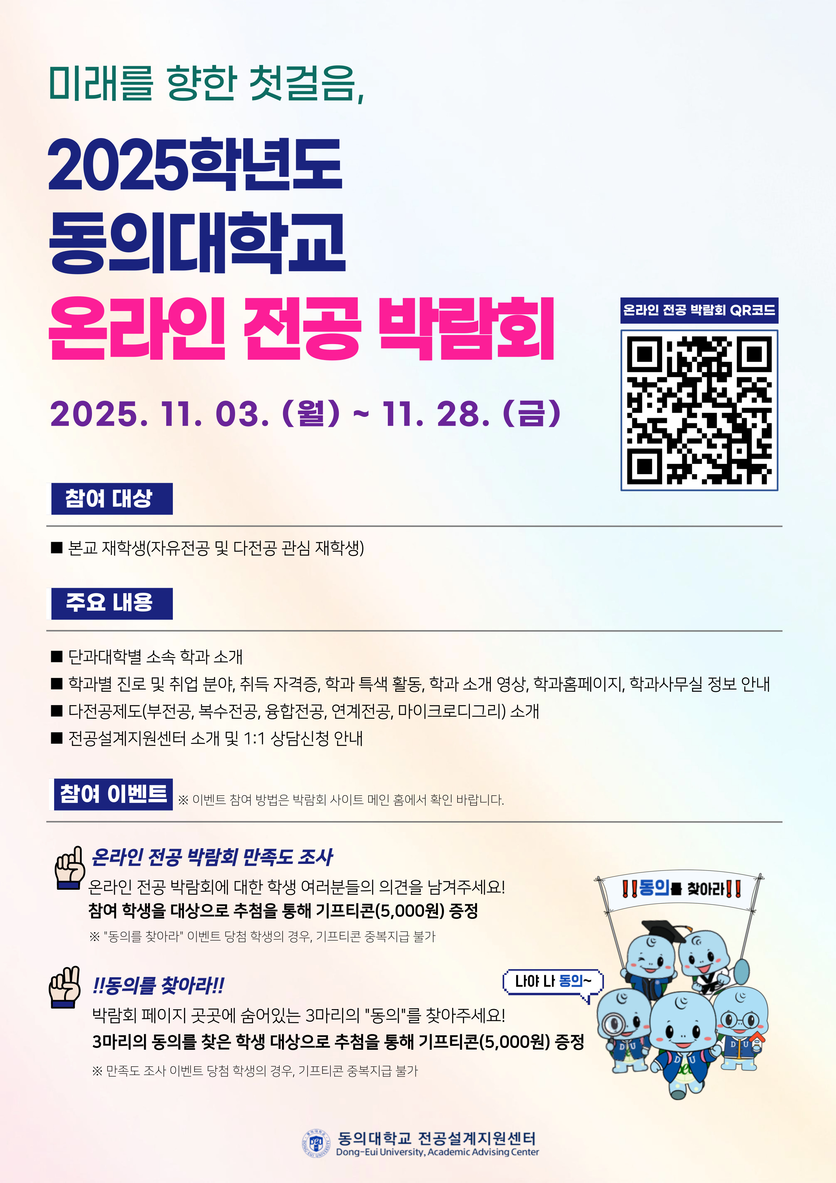 전공설계지원센터에서는 학생들의 학과(전공) 이해도를 제고하고, 합리적인 전공 선택을 지원하기 위해 2025학년도 동의대학교 온라인 전공 박람회를 다음과 같이 개최하고자 합니다.