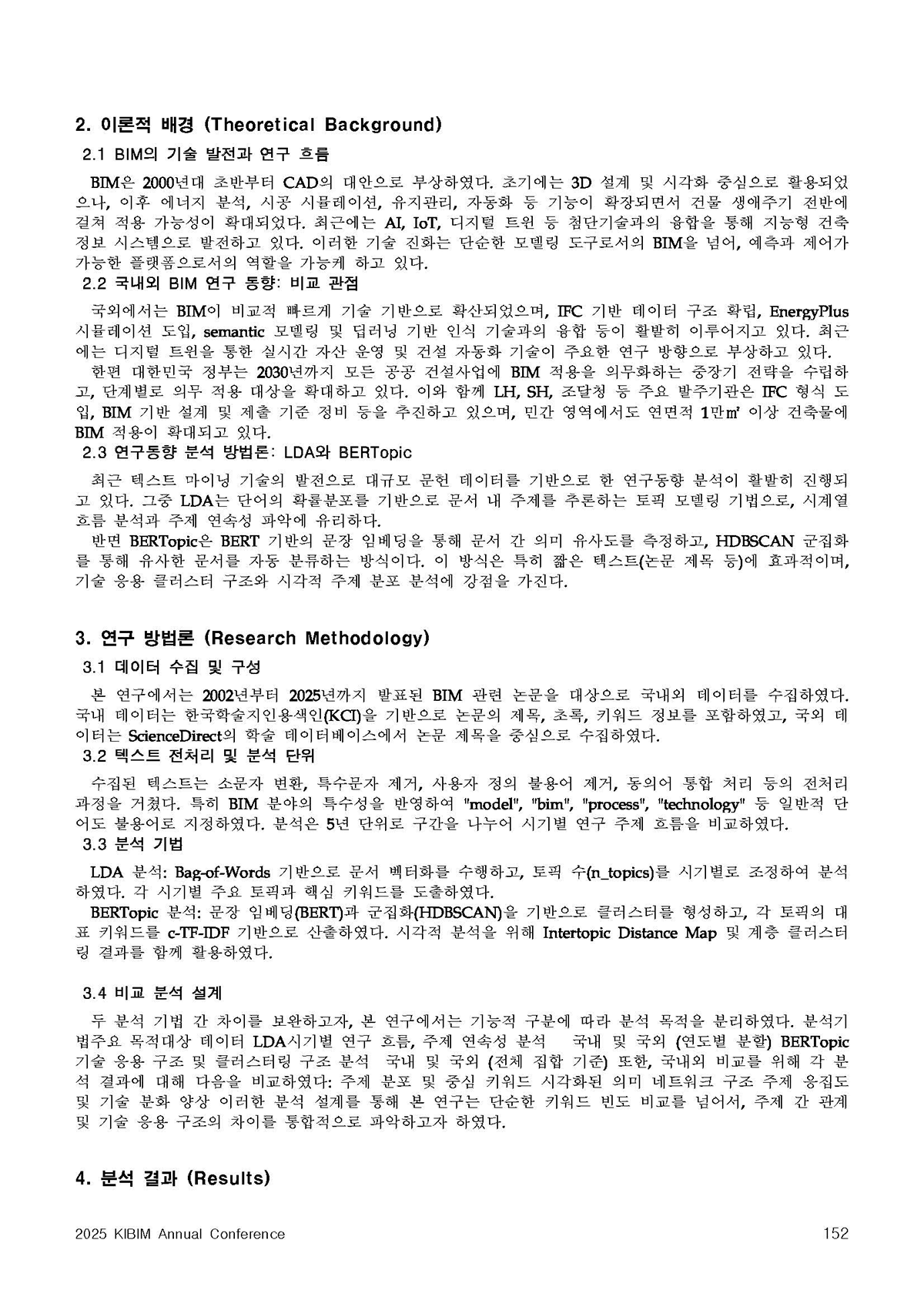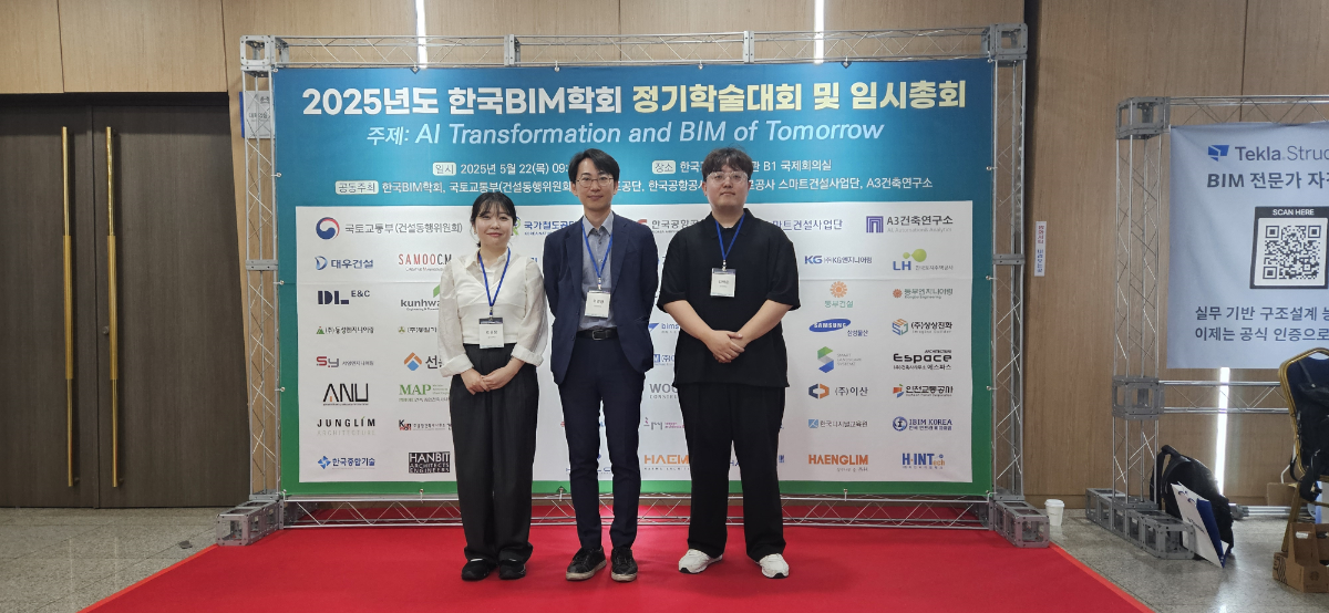 건축정보기술연구실(A.I.T, 지도교수: 이권형) 소속 교수와 대학원생 포함 총 3명이 2025년 한국BIM학회 정기 학술대회에 참석하였습니다. 박사과정 김백준 학생은 「국내외 BIM 연구동향의 비교분석: LDA 및 BERT 임베딩 기반 주제 모델링 활용」을 주제로 연구 성과를 발표하였고, 우수논문상을 수상하였습니다.