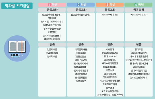 - 세계화 시대를 주도하는 영미권의 언어와 문화에 대해 폭 넓은 지식을 함양함으로써 국제적 안목을 지닌 지성과 유창한 영어구사능력을 겸비하여 글로벌 문화시대를 주도할 수 있는 다문화적 인재의 양성을 교육목표로 합니다. 또한 인문학의 보편적 가치와 의미를 탐색하고 이를 삶의 현장에 창의적이고 비판적으로 적용할 수 있는 교양인을 양성하는데 역점을 둡니다. 이를 위해 음성학, 문법론 등 어학적인 기초지식을 바탕으로 하여 실용회화와 작문의 능력을 신장하고, 영미권의 다양한 문화적 텍스트와 매체를 활용하여 영미문화에 대한 이해를 심화하는 데 중점을 두어 교육합니다.