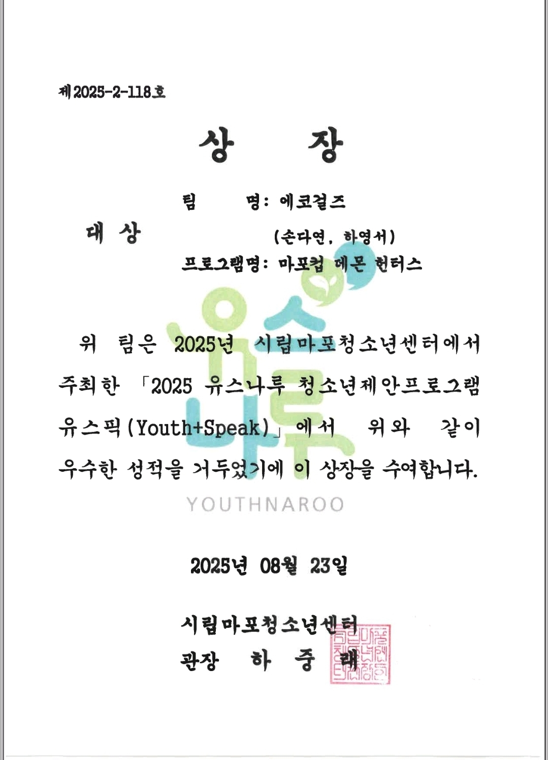 [2025]청소년제안프로그램 유스픽(Youth+Pick) 공모전 대상 수상 [에코걸즈팀 하영서, 손다연]