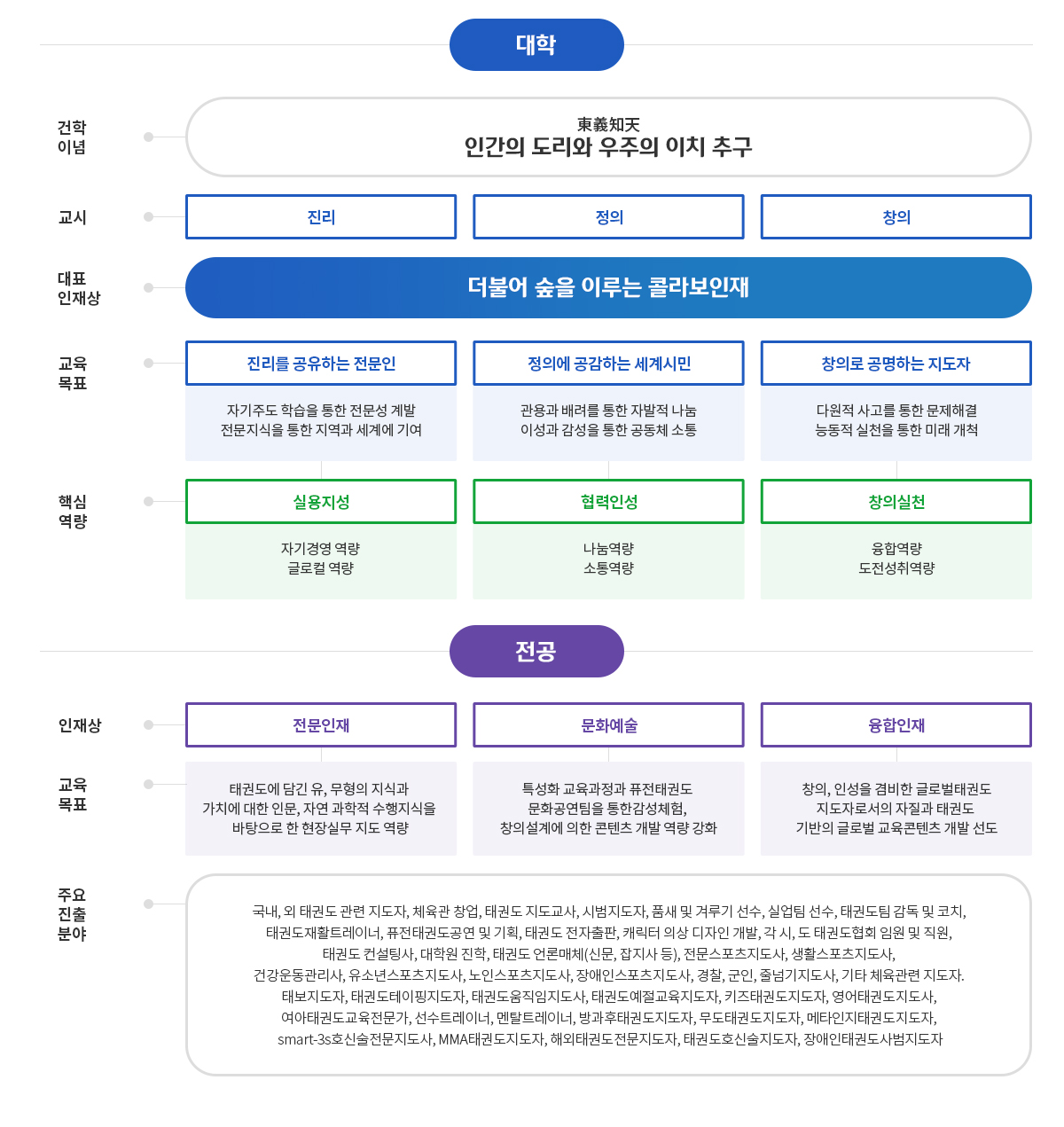 우리 대학의 대표 인재상인 ‘더불어 숲을 이루는 콜라보인재’를 바탕으로 태권도학전공의 인재상 및 교육목표는 태권도에 담긴 유, 무형의 지식과 가치에 대한 인문, 자연 과학적 수행지식을 바탕으로 한 현장실무 지도 역량을 위한 ‘전문인재’, 특성화 교육과정과 퓨전태권도 문화공연팀을 통한 감성체험, 창의설계에 의한 콘텐츠 개발 역량 강화를 위한 ‘문화예술’, 창의, 인성을 겸비한 글로벌태권도지도자로서의 자질과 태권도 기반의 글로벌 교육콘텐츠 개발 선도를 위한 ‘융합인재’ 상으로 설정하였습니다.
