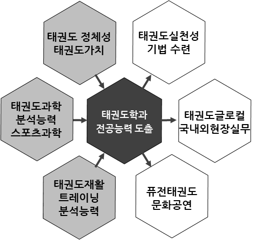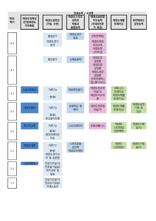 글로벌 태권도 인재 양성 교육과정 편성으로 태권도 융복합 인재 양성에 부응하는 맞춤형 교과목을 개발하였습니다.